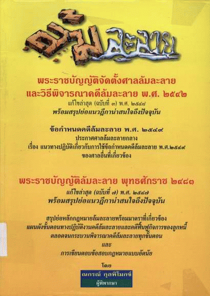 ล้มละลาย : พระราชบัญญัติจัดตั้งศาลล้มละลายและวิธีพิจารณาคดีล้มละลาย พ.ศ. 2542 แก้ไขล่าสุด (ฉบับที่ 3) พ.ศ. 2548 พร้อมสรุปย่อแนวฎีกาน่าสนใจถึงปัจจุบัน ข้อกำหนดคดีล้มละลาย พ.ศ. 2549... / โดย ณกรณ์ กุลพิโมกข์.