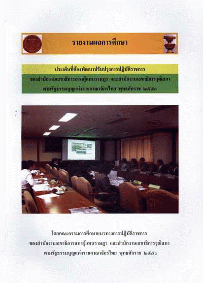 รายงานผลการศึกษาประเด็นที่ต้องพัฒนาปรับปรุงการปฏิบัติราชการ ของสำนักงานเลขาธิการสภาผู้แทนราษฎร และสำนักงานเลขาธิการวุฒิสภา ตามรัฐธรรมนูญแห่งราชอาณาจักรไทย พุทธศักราช 2550 / สำนักงานเลขาธิการสภาผู้แทนราษฎร.