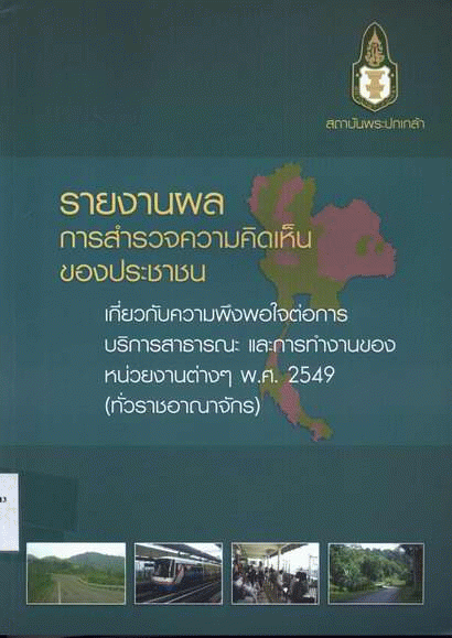 รายงานผลการสำรวจความคิดเห็นของประชาชนเกี่ยวกับความพึงพอใจต่อการบริการสาธารณะ และการทำงานของหน่วยงานต่างๆ พ.ศ. 2549 / สถาบันพระปกเกล้า.