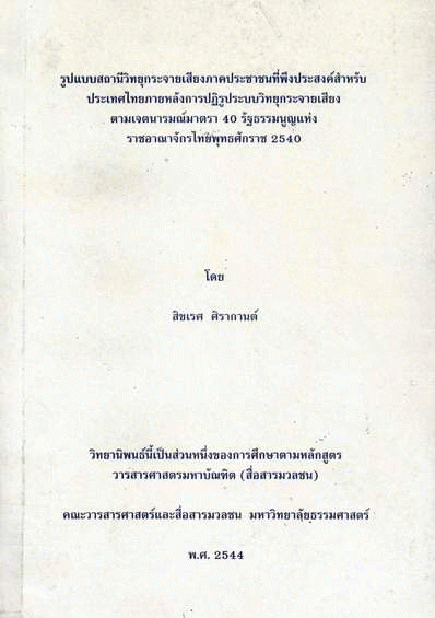 รูปแบบสถานีวิทยุกระจายเสียงภาคประชาชนที่พึงประสงค์สำหรับประเทศไทยภายหลังการปฏิรูประบบวิทยุกระจายเสียง ตามเจตนารมณ์มาตรา 40 รัฐธรรมนูญแห่งราชอาณาจักรไทย พุทธศักราช 2540 / สิขเรศ ศิรากานต์.