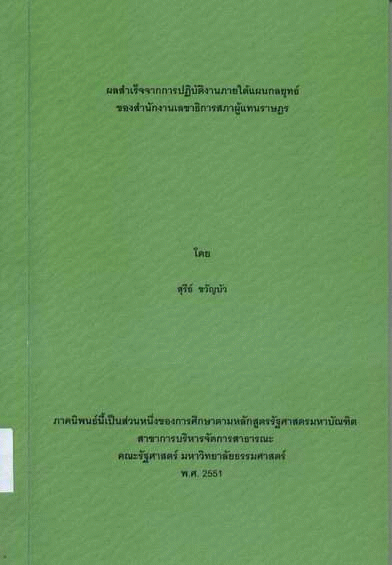 ผลสำเร็จจากการปฏิบัติงานภายใต้แผนกลยุทธ์ของสำนักงานเลขาธิการสภาผู้แทนราษฎร / สุรีย์ ขวัญบัว.