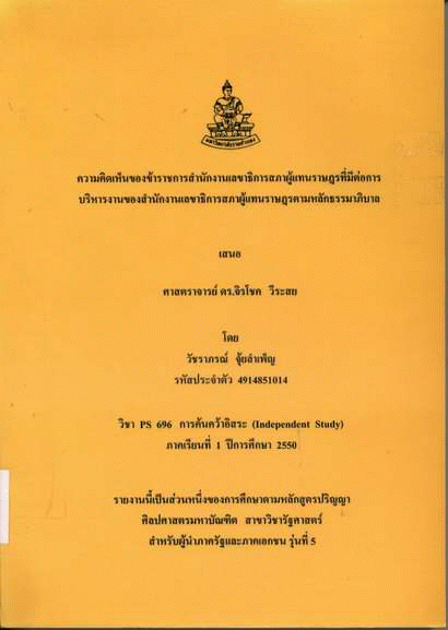 ความคิดเห็นของข้าราชการสำนักงานเลขาธิการสภาผู้แทนราษฎรที่มีต่อการบริหารงานของสำนักงานเลขาธิการสภาผู้แทนราษฎรตามหลักธรรมาภิบาล / วัชราภรณ์ จุ้ยลำเพ็ญ.