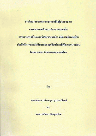 การศึกษาสมรรถนะของความเป็นผู้ประกอบการ ความสามารถด้านการจัดการขององค์กรความสามารถด้านการแข่งขันขององค์กร ที่มีความสัมพันธ์กับประสิทธิภาพการดำเนินงานธุรกิจบริการที่พักแรมขนาดย่อม ในเขตภาคตะวันออกของประเทศไทย / สุดา สุวรรณาภิรมย์, ศรัณยา เลิศพุทธรักษ์.