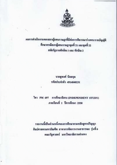 ผลการดำเนินงานของสภาผู้แทนราษฎรที่มีต่อการพิจารณาร่างพระราชบัญญัติ ศึกษากรณีสภาผู้แทนราษฎรชุดที่ 21 และชุดที่ 22 สมัยรัฐบาลทักษิณ 1 และ ทักษิณ 2 / ชูพงศ์ นิลสกุล.