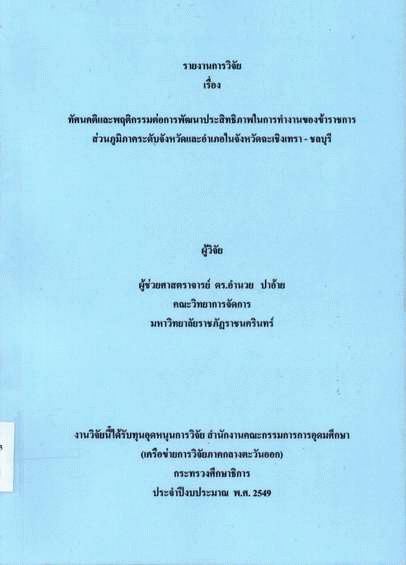 ทัศนคติและพฤติกรรมต่อการพัฒนาประสิทธิภาพในการทำงานของข้าราชการส่วนภูมิภาคระดับจังหวัดและอำเภอในจังหวัดฉะเชิงเทรา - ชลบุรี / อำนวย ปาอ้าย.