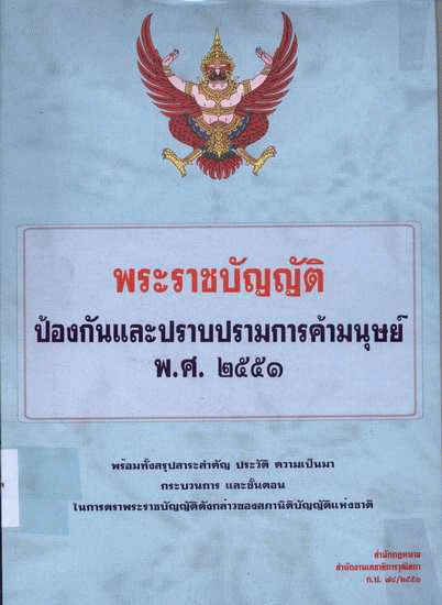 พระราชบัญญัติป้องกันและปราบปรามการค้ามนุษย์ พ.ศ. 2551พร้อมทั้งสรุปสาระสำคัญ ประวัติ และความเป็นมา กระบวนการ และขั้นตอนในการตราพระราชบัญญัติดังกล่าวของสภานิติบัญญัติแห่งชาติ / สำนักกฎหมาย สำนักงานเลขาธิการวุฒิสภา.