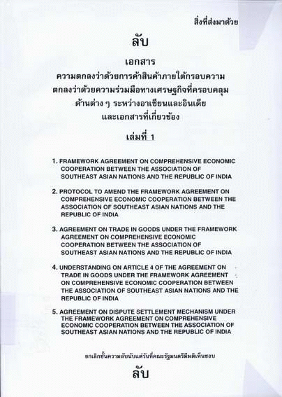 Framework agreement on comprehensive economic cooperation between the association of Southeast Asian nations and the republic of India : ความตกลงว่าด้วยการค้าสินค้าภายใต้กรอบความตกลงว่าด้วยความร่วมมือทางเศรษฐกิจที่ครอบคลุมด้านต่างๆ ระหว่างอาเซียนและอินเดีย และเอกสารที่เกี่ยวข้อง เล่มที่ 1.