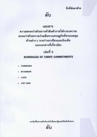 Schedules of tariff commitments : Cambodia Myanmar Laos Viet nam : ความตกลงว่าด้วยการค้าสินค้าภายใต้กรอบความตกลงว่าด้วยความร่วมมือทางเศรษฐกิจที่ครอบคลุมด้านต่าง ๆ ระหว่างอาเซียนและอินเดีย และเอกสารที่เกี่ยวข้อง เล่มที่ 5.