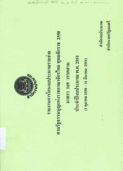 รายงานการโอนงบประมาณรายจ่ายตามรัฐธรรมนูญแห่งราชอาณาจักรไทย พุทธศักราช 2550 มาตรา 169 วรรคสาม ประจำปีงบประมาณ พ.ศ. 2551 (1 ตุลาคม 2550 - 31 มีนาคม 2551) / สำนักงบประมาณ.