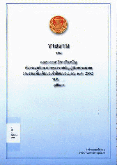 รายงานของคณะกรรมาธิการวิสามัญพิจารณาศึกษาร่างพระราชบัญญัติงบประมาณรายจ่ายเพิ่มเติมประจำปีงบประมาณ พ.ศ. 2552 พ.ศ... วุฒิสภา / สำนักกรรมาธิการ 1 สำนักงานเลขาธิการวุฒิสภา.