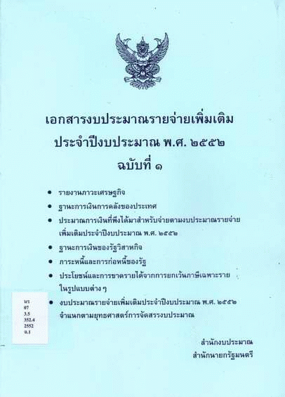 เอกสารงบประมาณรายจ่ายเพิ่มเติม ประจำปีงบประมาณ พ.ศ. 2552 ฉบับที่ 1 / สำนักงบประมาณ.