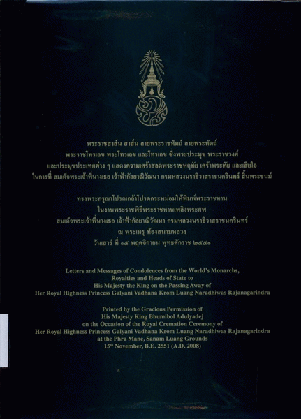 พระราชสาส์น สาส์น ลายพระราชหัตถ์ ลายพระหัตถ์ พระราชโทรเลข พระโทรเลข และโทรเลข ซึ่งพระประมุข พระราชวงศ์ และประมุขประเทศต่างๆ แสดงความเศร้าสลดพระราชหฤทัย เศร้าพระทัย และเสียใจ ในการที่ สมเด็จพระเจ้าพี่นางเธอ เจ้าฟ้ากัลยาณิวัฒนา กรมหลวงนราธิวาสราชนครินทร์ สิ = Letters and messages of condolences from the world's monarchs, royalties and heads of state to His Majesty the King on the passing away of Her Royal Highness Princess Galyani Vadhana Krom Luang Naradhiwas Rajanagarindra.