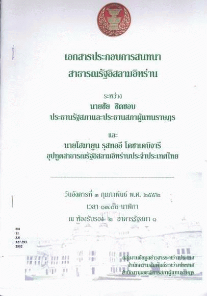 เอกสารประกอบการสนทนาสาธารณรัฐอิสลามอิหร่าน ระหว่างนายชัย ชิดชอบ ประธานรัฐสภาและประธานสภาผู้แทนราษฎร และ นายโฮมายูน รุสทออี โคชาเคบิจารี อุปทูตสาธารณรัฐอิสลามอิหร่านประจำประเทศไทย / สำนักความสัมพันธ์ระหว่างประเทศ สำนักงานเลขาธิการสภาผู้แทนราษฎร.