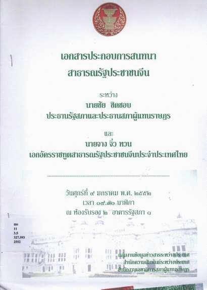 เอกสารประกอบการสนทนาสาธารณรัฐประชาชนจีน ระหว่าง นายชัย ชิดชอบ ประธานรัฐสภาและประธานสภาผู้แทนราษฎร และนายจาง จิ่ว หวน เอกอัครราชทูตสาธารณรัฐประชาชนจีนประจำประเทศไทย / สำนักความสัมพันธ์ระหว่างประเทศ สำนักงานเลขาธิการสภาผู้แทนราษฎร.