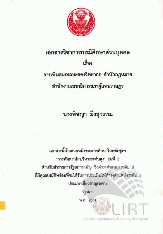 การเพิ่มสมรรถนะของวิทยากร สำนักกฎหมาย สำนักงานเลขาธิการสภาผู้แทนราษฎร (เอกสารวิชาการกรณีศึกษาส่วนบุคคล) / พิชญา มิ่งสุวรรณ