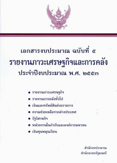 เอกสารงบประมาณ ฉบับที่ 5 รายงานภาวะเศรษฐกิจและการคลัง ประจำปีงบประมาณ พ.ศ. 2553 รายงานภาวะเศรษฐกิจ รายงานการคลังทั่วไป เงินและทรัพย์สินช่วยราชการ ความช่วยเหลือจากต่างประเทศ รัฐวิสาหกิจ หน่วยงานในกำกับและองค์การมหาชน เงินทุนหมุนเวียน / สำนักงบประมาณ.