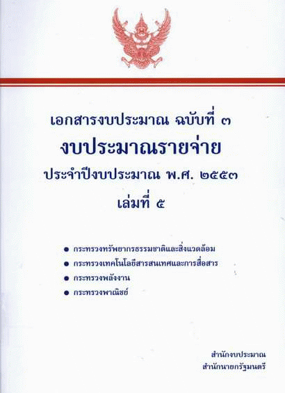 เอกสารงบประมาณ ฉบับที่ 3 งบประมาณรายจ่าย ประจำปีงบประมาณ พ.ศ. 2553 เล่มที่ 5 กระทรวงทรัพยากรธรรมชาติและสิ่งแวดล้อม กระทรวงเทคโนโลยีสารสนเทศและการสื่อสาร กระทรวงพลังงาน กระทรวงพาณิชย์ / สำนักงบประมาณ.