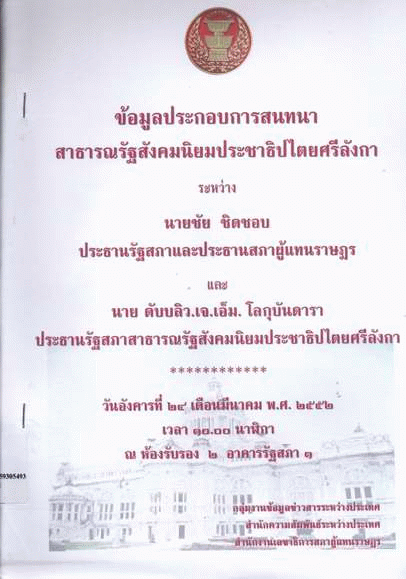 ข้อมูลประกอบการสนทนาสาธารณรัฐสังคมนิยมประชาธิปไตยศรีลังการะหว่าง นายชัย ชิดชอบ ประธานรัฐสภาและประธานสภาผู้แทนราษฎร และ นายดับบลิว.เจ.เอ็ม. โลกุบันดารา ประธานรรัฐสภาสาธารณรัฐสังคมนิยมประชาธิปไตยศรีลังกา / สำนักความสัมพันธ์ระหว่างประเทศ สำนักงานเลขาธิการสภาผู้แทนราษฎร.