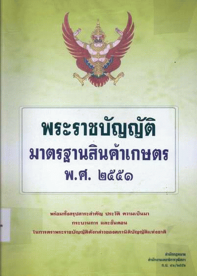 พระราชบัญญัติมาตรฐานสินค้าเกษตร พ.ศ. 2551 พร้อมทั้งสรุปสาระสำคัญ ประวัติ ความเป็นมา กระบวนการ และขั้นตอนในการตราพระราชบัญญัติดังกล่าวของสภานิติบัญญัติแห่งชาติ / สำนักกฎหมาย สำนักงานเลขาธิการวุฒิสภา,