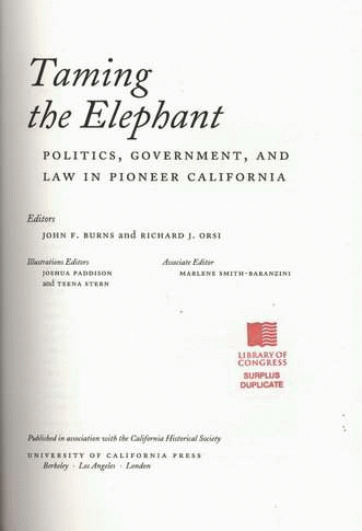 Taming the elephant : politics, government, and law in pioneer California / John F. Burns and Richard J. Orsi, editors ; illustrations editors Joshua Paddison and Teena Stern ; associate editor Marlene Smith-Baranzini.