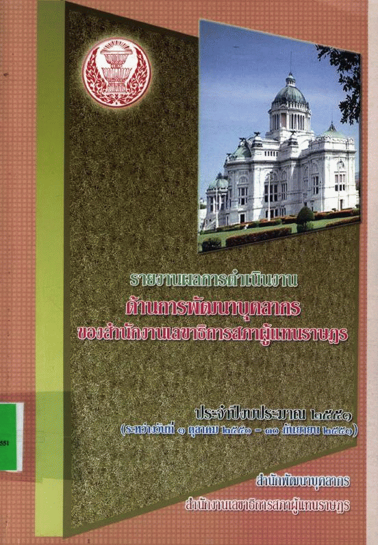 รายงานผลการดำเนินงานด้านการพัฒนาบุคลากร ของสำนักงานเลขาธิการสภาผู้แทนราษฎร ประจำปีงบประมาณ 2551 (ระหว่างวันที่ 1 ตุลาคม 2550 - 30 กันยายน 2551) / สำนักพัฒนาบุคลากร สำนักงานเลขาธิการสภาผู้แทนราษฎร.