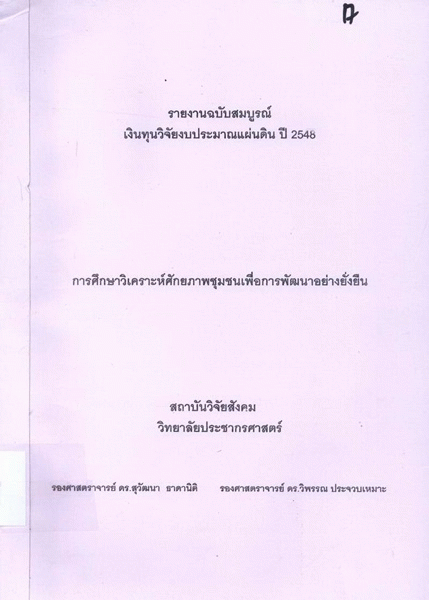 การศึกษาวิเคราะห์ศักยภาพชุมชนเพื่อการพัฒนาอย่างยั่งยืน / สุวัฒนา ธาดานิติ, วิพรรณ ประจวบเหมาะ