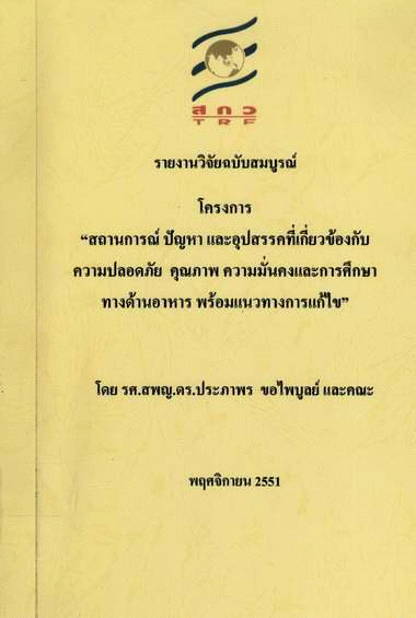 สถานการณ์ ปัญหา และอุปสรรคที่เกี่ยวข้องกับความปลอดภัย คุณภาพ ความมั่นคงและการศึกษาทางด้านอาหาร พร้อมแนวทางการแก้ไข / ประภาพร ขอไพบูลย์.