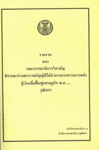 รายงานของคณะกรรมาธิการวิสามัญพิจารณาร่างพระราชบัญญัติให้อำนาจกระทรวงการคลังกู้เงินเพื่อฟื้นฟูเศรษฐกิจ พ.ศ. .... วุฒิสภา / สำนักกรรมาธิการ 1 สำนักงานเลขาธิการวุฒิสภา.