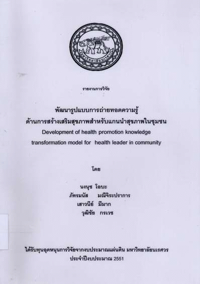 พัฒนารูปแบบการถ่ายทอดความรู้ด้านการสร้างเสริมสุขภาพสำหรับแกนนำสุขภาพในชุมชน : รายงานการวิจัย / นงนุช โอบะ...[และคนอื่น ๆ]