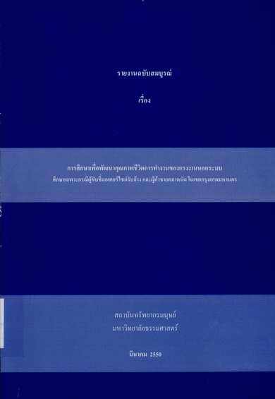 การศึกษาเพื่อพัฒนาคุณภาพชีวิตการทำงานของแรงงานนอกระบบ ศึกษาเฉพาะกรณีผู้ขับขี่มอเตอร์ไซด์รับจ้าง และผู้ค้าขายตลาดนัดในเขตกรุงเทพมหานคร / สมศักดิ์ นัคลาจารย์.