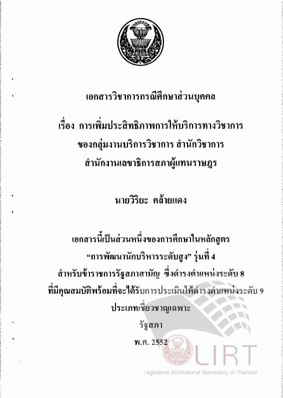 การเพิ่มประสิทธิภาพการให้บริการทางวิชาการของกลุ่มงานบริการวิชาการ สำนักวิชาการ สำนักงานเลขาธิการสภาผู้แทนราษฎร (เอกสารวิชาการกรณีศึกษาส่วนบุคคล) / วิริยะ คล้ายแดง.