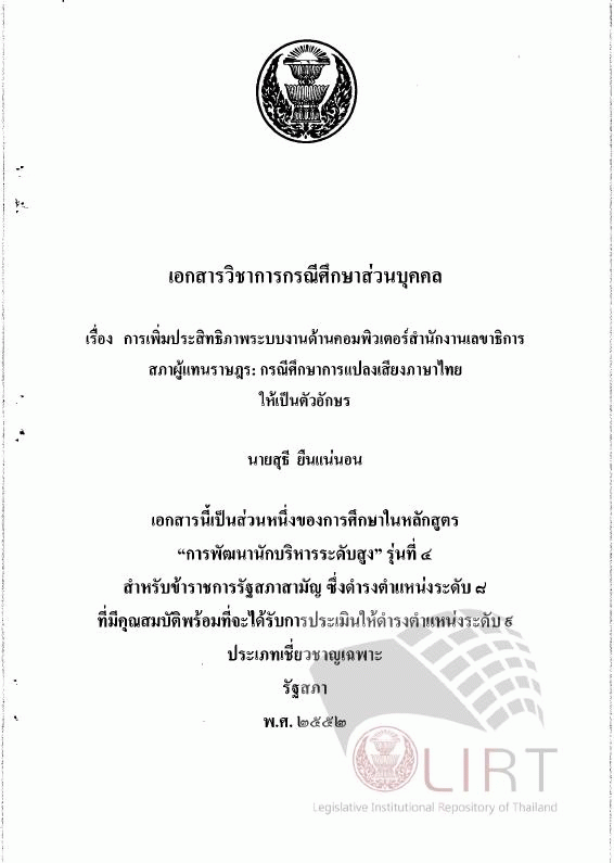 การเพิ่มประสิทธิภาพระบบงานด้านคอมพิวเตอร์สำนักงานเลขาธิการสภาผู้แทนราษฎร : กรณีศึกษาการแปลงเสียงภาษาไทยให้เป็นตัวอักษร (เอกสารวิชาการกรณีศึกษาส่วนบุคคล) / พจนา พรกนกพิพัฒน์.