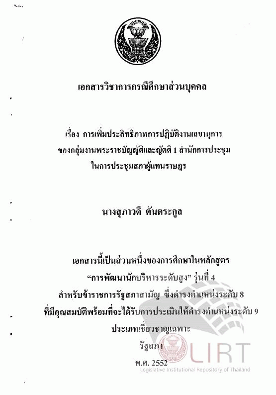 การเพิ่มประสิทธิภาพการปฏิบัติงานเลขานุการของกลุ่มงานพระราชบัญญัติและญัตติ 1 สำนักการประชุม ในการประชุมสภาผู้แทนราษฎร / สุภาวดี ตันตระกูล.