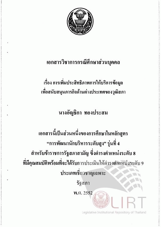 การเพิ่มประสิทธิภาพการให้บริการข้อมูลเพื่อสนับสนุนภารกิจด้านต่างประเทศของวุฒิสภา (เอกสารวิชาการกรณีศึกษาส่วนบุคคล) / อัญธิกา ทองประสม.