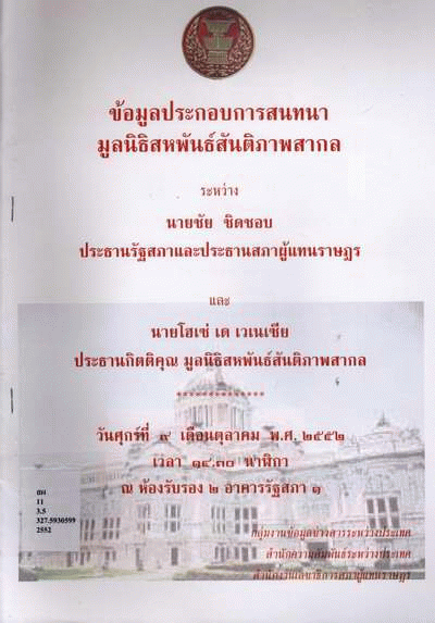 ข้อมูลประกอบการสนทนามูลนิธิสหพันธ์สันติภาพสากล ระหว่างนายชัย ชิดชอบ ประธานรัฐสภาและประธานสภาผู้แทนราษฎร และนายโฮเซ่ เด เวเนเซีย ประธานกิตติคุณ มูลนิธิสหพันธ์สันติภาพสากล / กลุ่มงานข้อมูลข่าวสารระหว่างประเทศ สำนักความสัมพันธ์ระหว่างประเทศ สำนักงานเลขาธิการสภาผู้แทนราษฎร.