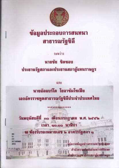 ขัอมูลประกอบการสนทนาสาธารณรัฐชิลี ระหว่างนายชัย ชิดชอบ ประธานรัฐสภาและประธานสภาผู้แทนราษฎร และนายอัลแบร์โต โยอาชัมโซเฟีย เอกอัครราชทูตสาธารณรัฐชิลีประจำประเทศไทย / สำนักความสัมพันธ์ระหว่างประเทศ สำนักงานเลขาธิการสภาผู้แทนราษฎร.