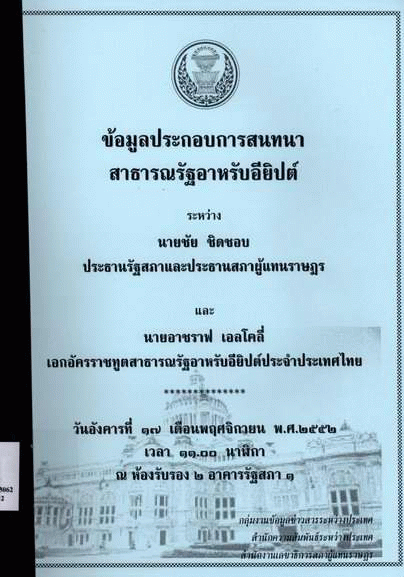 ข้อมูลประกอบการสนทนาสาธารณรัฐอาหรับอียิปต์ ระหว่าง นายชัย ชิดชอบ ประธานรัฐสภาและประธานสภาผู้แทนราษฎร และ นายอาชราฟ เอลโคลี่ เอกอัครราชทูตสาธารณรัฐอาหรับอียิปต์ประจำประเทศไทย / สำนักความสัมพันธ์ระหว่างประเทศ สำนักงานเลขาธิการสภาผู้แทนราษฎร.