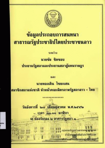 ข้อมูลประกอบการสนทนาสาธารณรัฐประชาธิปไตยประชาชนลาว ระหว่าง นายชัย ชิดชอบ ประธานรัฐสภาและประธานสภาผู้แทนราษฎร และ นายทองเติน ไซยะเสน สมาชิกสภาแห่งชาติ หัวหน้าคณะมิตรภาพรัฐสภาลาว-ไทย / สำนักความสัมพันธ์ระหว่างประเทศ สำนักงานเลขาธิการสภาผู้แทนราษฎร.