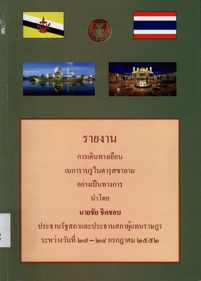 รายงานการเดินทางเยือนเนการาบรูไนดารุสซาลาม อย่างเป็นทางการนำโดย นายชัย ชิดชอบ ประธานรัฐสภาและประธานสภาผู้แทนราษฎร ระหว่างวันที่ 27-28 กรกฎาคม 2552 / สำนักความสัมพันธ์ระหว่างประเทศ สำนักงานเลขาธิการสภาผู้แทนราษฎร.