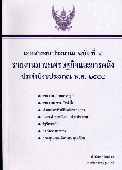 เอกสารงบประมาณ ฉบับที่ 5 รายงานภาวะเศรษฐกิจและการคลัง ประจำปีงบประมาณ พ.ศ. 2554 รายงานภาวะเศรษฐกิจ รายงานการคลังทั่วไป เงินและทรัพย์สินช่วยราชการ ความช่วยเหลือจากต่างประเทศ รัฐวิสาหกิจ องค์การมหาชน กองทุนและเงินทุนหมุนเวียน / สำนักงบประมาณ.