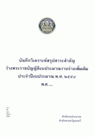 บันทึกวิเคราะห์สรุปสาระสำคัญร่างพระราชบัญญัติงบประมาณรายจ่ายเพิ่มเติม ประจำปีงบประมาณ พ.ศ. 2554 พ.ศ. .... / สำนักงบประมาณ.