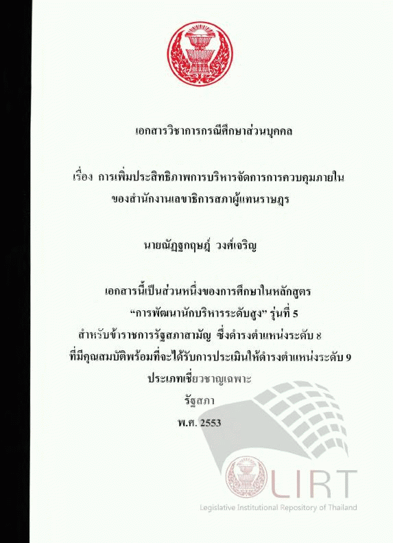 การเพิ่มประสิทธิภาพการบริหารจัดการการควบคุมภายในของสำนักงานเลขาธิการสภาผู้แทนราษฎร (เอกสารวิชาการกรณีศึกษาส่วนบุคคล)