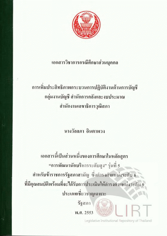 การเพิ่มประสิทธิภาพกระบวนการปฏิบัติงานด้านบัญชี กลุ่มงานบัญชี สำนักการคลังและงบประมาณ สำนักงานเลขาธิการวุฒิสภา (เอกสารวิชาการกรณีศึกษาส่วนบุคคล).