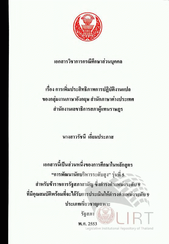 การเพิ่มประสิทธิภาพการปฏิบัติงานแปลของกลุ่มงานภาษาอังกฤษ สำนักภาษาต่างประเทศ สำนักงานเลขาธิการสภาผู้แทนราษฎร : เอกสารวิชาการกรณีศึกษาส่วนบุคคล