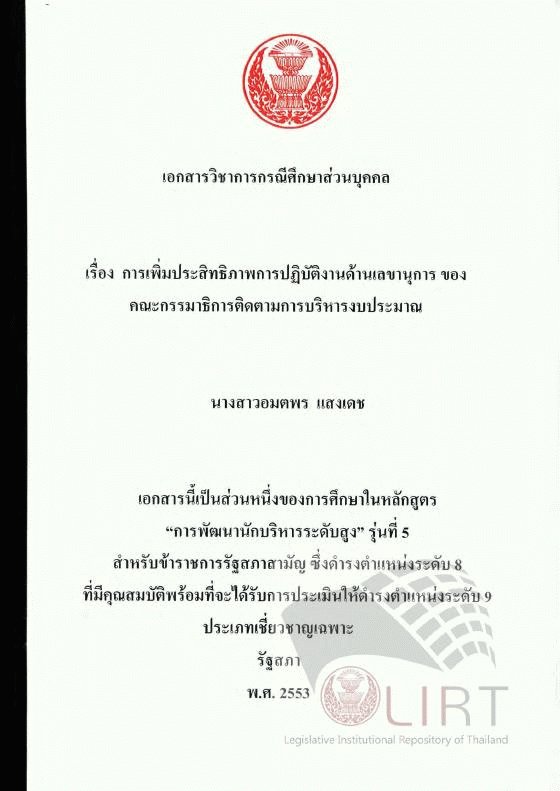 การเพิ่มประสิทธิภาพการปฏิบัติงานด้านเลขานุการของคณะกรรมาธิการติดตามการบริหารงบประมาณ (เอกสารวิชาการกรณีศึกษาส่วนบุคคล).