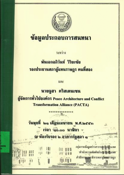ข้อมูลประกอบการสนทนา ระหว่าง พันเอกอภิวันท์ วิริยะชัย รองประธานสภาผู้แทนราษฎร คนที่สอง และนายจูฮา คริสเตนเซน ผู้จัดการทั่วไปองค์กร Peace Architecture and Conflict Transformation Alliance (PACTA) / สำนักความสัมพันธ์ระหว่างประเทศ สำนักงานเลขาธิการสภาผู้แทนราษฎร.