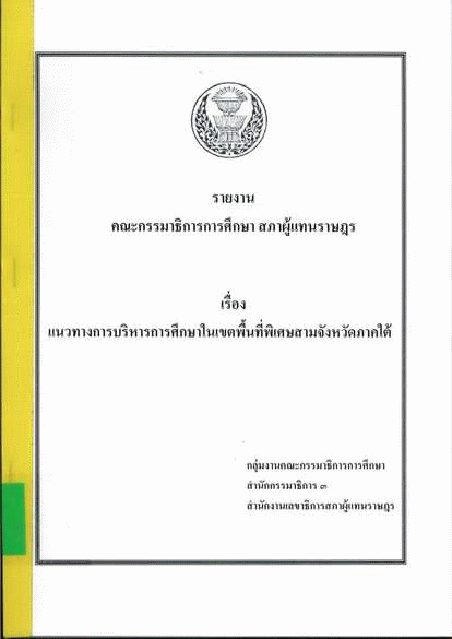 รายงานคณะกรรมาธิการการศึกษา สภาผู้แทนราษฎร เรื่อง แนวทางการบริหารการศึกษาในเขตพื้นที่พิเศษสามจังหวัดภาคใต้ / สำนักกรรมาธิการ 3 สำนักงานเลขาธิการสภาผู้แทนราษฎร.