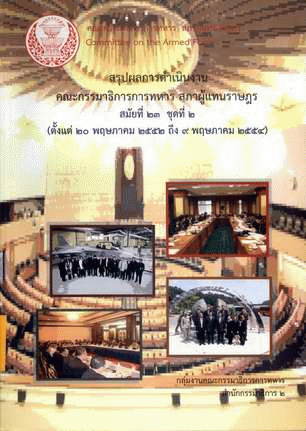 สรุปผลการดำเนินงานคณะกรรมาธิการการทหาร สภาผู้แทนราษฎร สมัยที่ 23 ชุดที่ 2 (ตั้งแต่ 20 พฤษภาคม 2552 ถึง 9 พฤษภาคม 2554) / สำนักกรรมาธิการ 2 สำนักงานเลขาธิการสภาผู้แทนราษฎร.