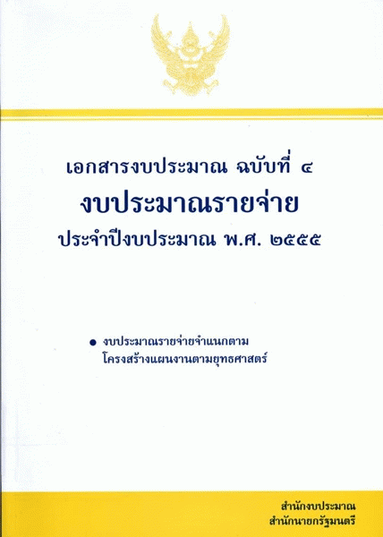 เอกสารงบประมาณ ฉบับที่ 4 งบประมาณรายจ่าย ประจำปีงบประมาณ พ.ศ. 2555 งบประมาณรายจ่ายจำแนกตามโครงสร้างแผนงานตามยุทธศาสตร์ / สำนักงบประมาณ.