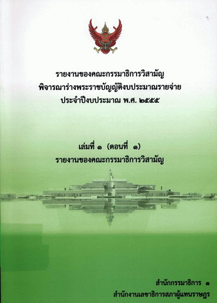 รายงานของคณะกรรมาธิการวิสามัญพิจารณาร่างพระราชบัญญัติงบประมาณรายจ่าย ประจำปีงบประมาณ พ.ศ. 2555 เล่มที่ 1 (ตอนที่ 1) รายงานของคณะกรรมาธิการวิสามัญ / สำนักกรรมาธิการ 1 สำนักงานเลขาธิการสภาผู้แทนราษฎร.